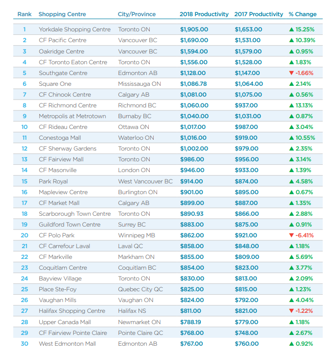 Canada’s Most Productive Malls by Square Foot 2018 numbers